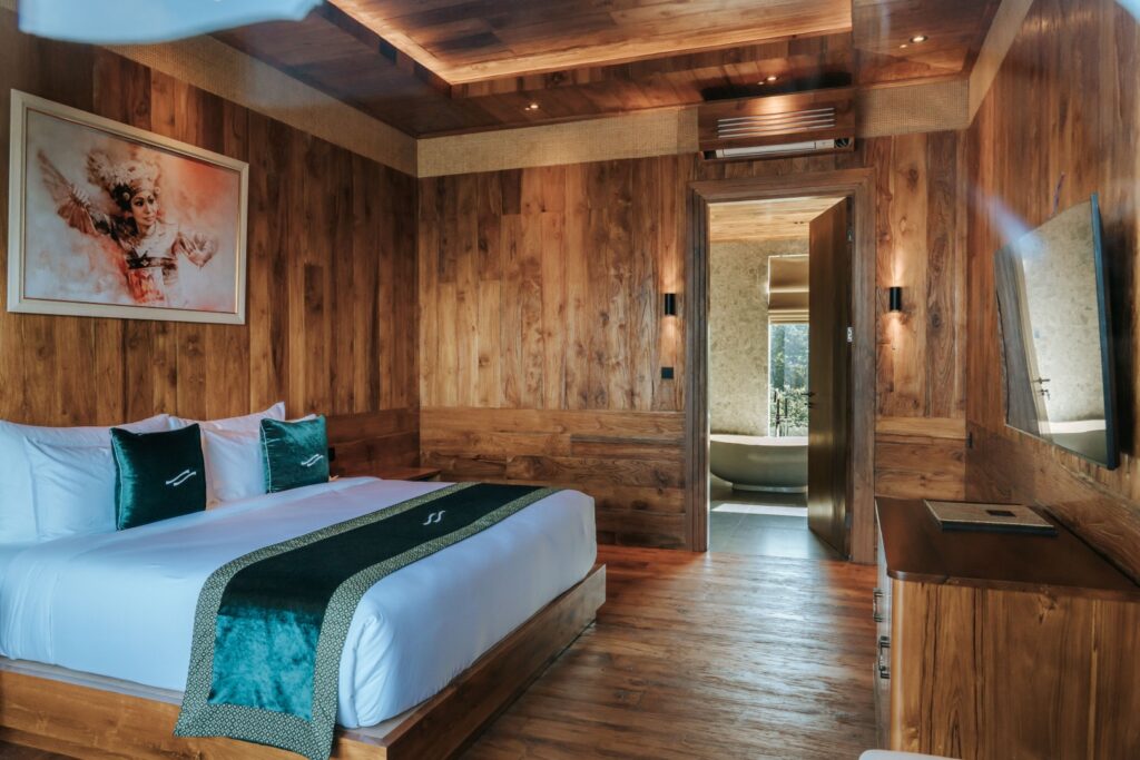 A spacious room features a king-sized bed and a grand private bathroom with a Jacuzzi, smart toilet, and both an indoor and outdoor shower