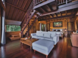A spacious 163 sqm duplex villas offer peace and tranquility amidst the jungle and mist-covered mountains. Designed in authentic Balinese style, these villas feature a King bed on the lower level and twin beds on the upper level.