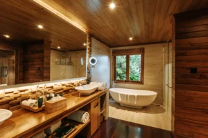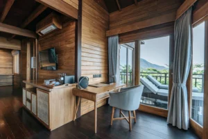 Enjoy a separate indoor and outdoor bathroom with a rain shower and terrazzo bathtub. Floor-to-ceiling windows flood the villa with natural light, and a large terrace provides panoramic views. Outside, relax in your private infinity pool for the ultimate luxurious stay.
