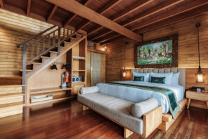 On the lower level, you’ll find a king-size bed, while the upper level features a queen-size bed, ensuring ample space for relaxation. Step outside onto your private terrace to discover a rejuvenating jacuzzi, the ideal spot to unwind and soak up the sights and sounds of the surrounding jungle.